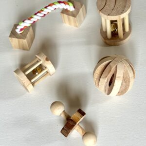 Ce lot de 5 jouets en bois naturel est parfait pour les lapins, hamsters, cochons d’Inde et autres petits animaux. Pensés pour favoriser l’exploration, la mastication et l’exercice, ces accessoires solides et ludiques sont idéaux pour prévenir l’ennui et encourager un comportement actif et sain.