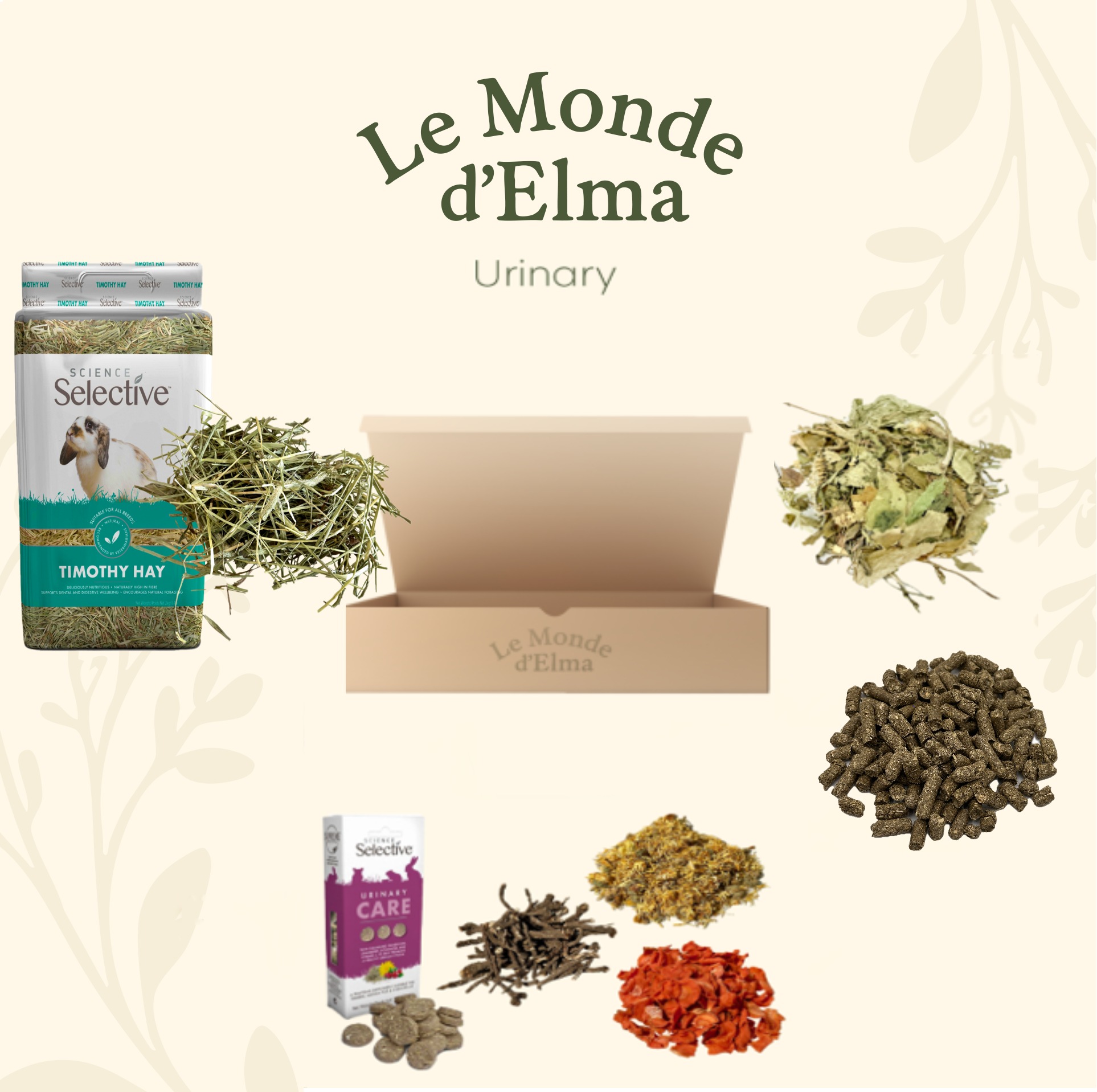 Kit Urinaire : foin Timothy, granulés, herbes et friandises adaptées pour prévenir les calculs et soutenir la santé urinaire des lapins nains ou grandes races.